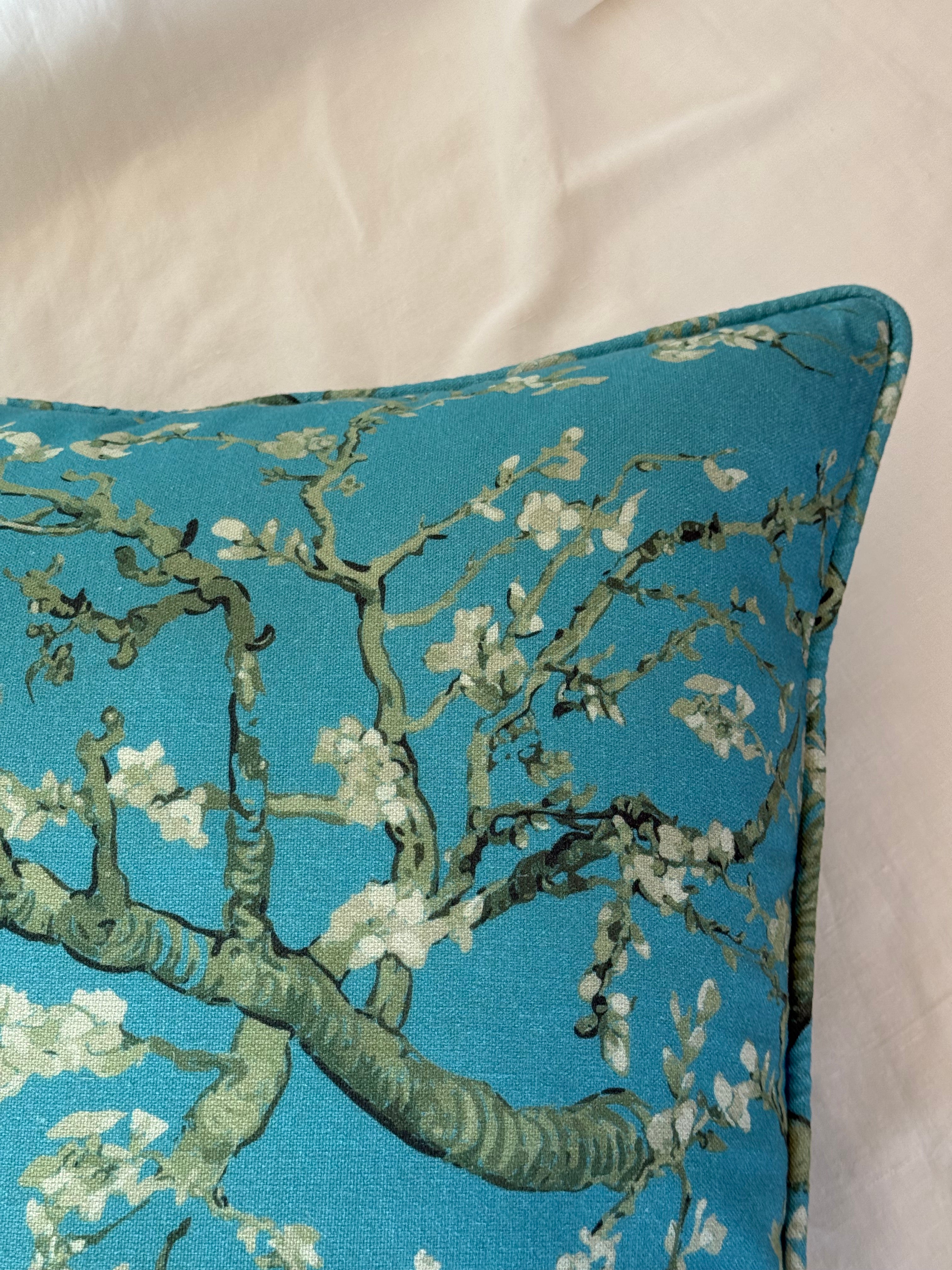 Εμπνευσμένο από τον πίνακα "Ανθισμένη αμυγδαλιά" του Van Gogh, το μαξιλάρι αυτό από βαμβακερό ύφασμα συνδυάζει το γαλάζιο του ουρανού με πινελιές σε λαδί,ανοιχτό πράσινο και εκρού αποχρώσεις. Η περιμετρική διακόσμηση με κορδόνι προσθέτει πολυτέλεια και ένταση αναδεικνύοντας το print, ενώ το ιδιαίτερο σχήμα του το αναδεικνύουν σε statement κομμάτι διακόσμησης.