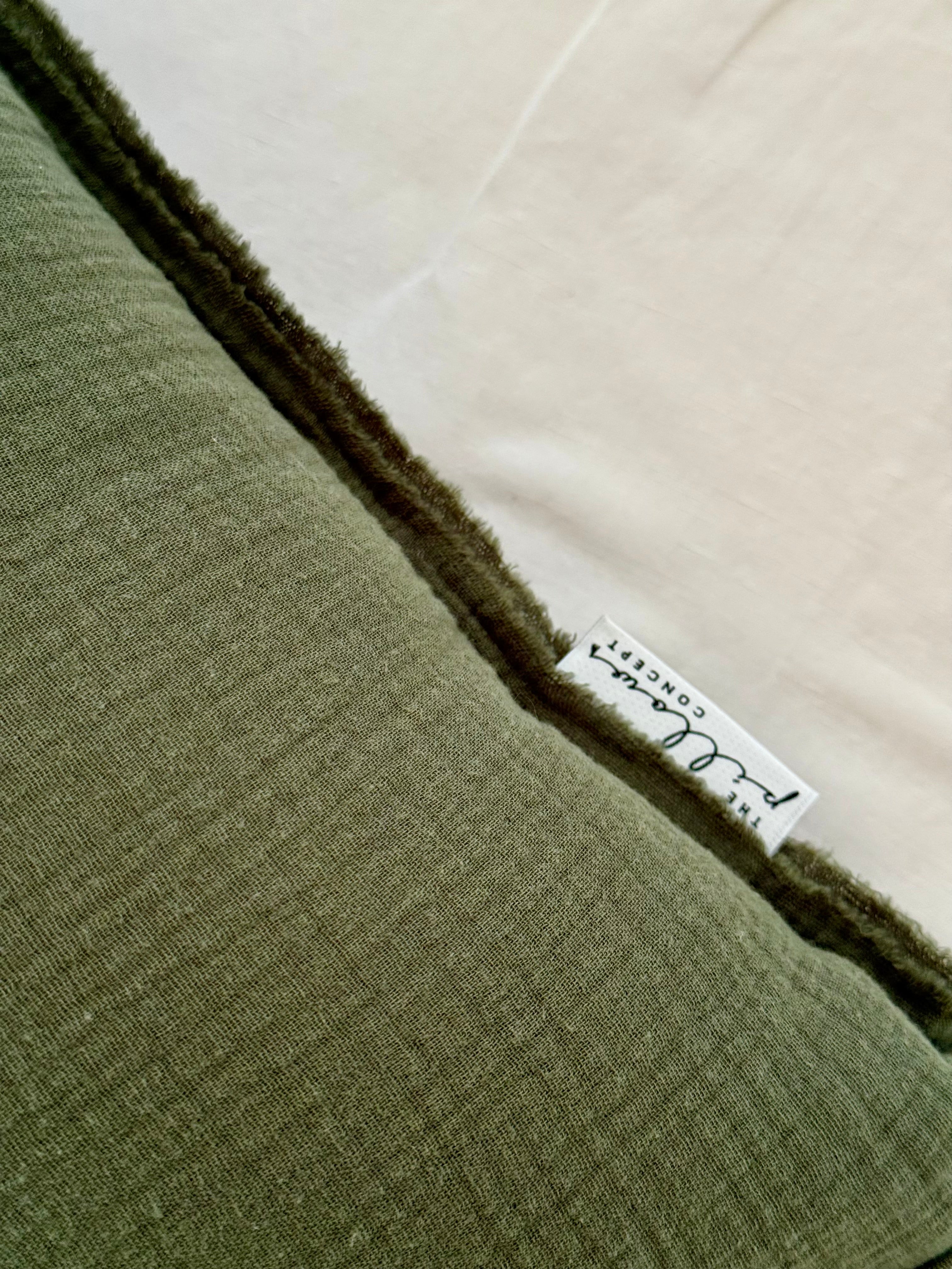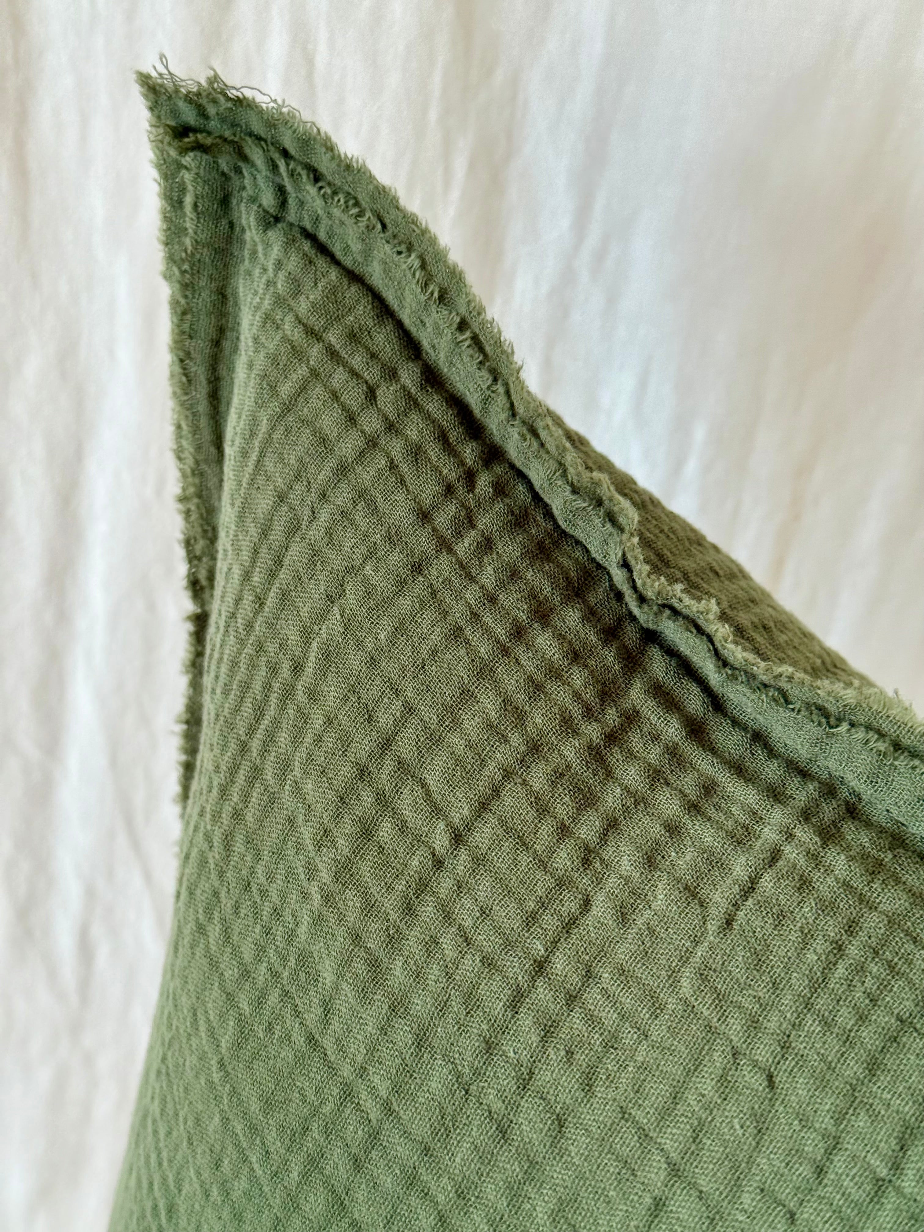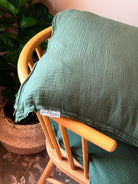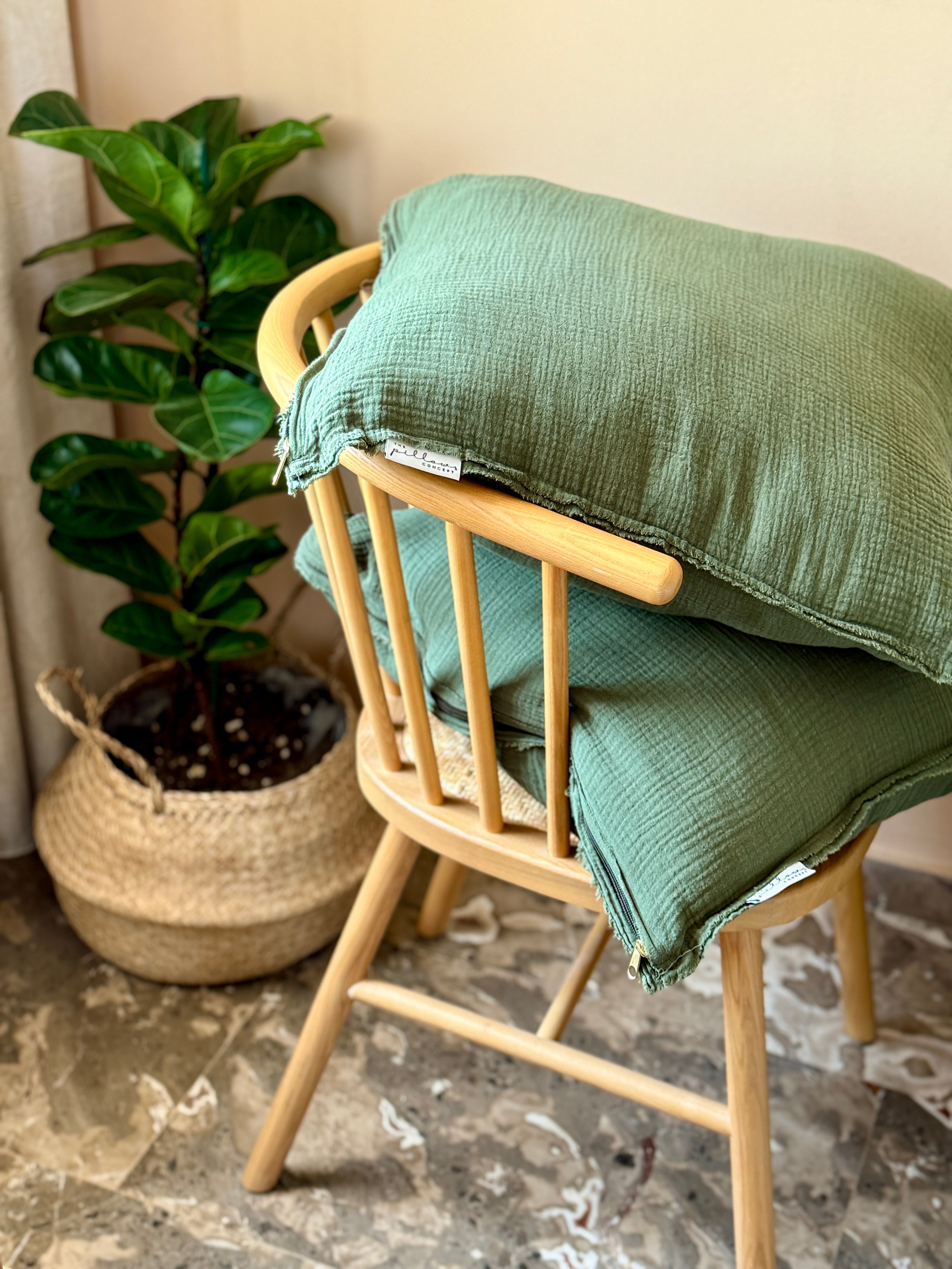 Σε βαθύ πράσινο χρώμα, το μαξιλάρι αυτό φέρνει μια αίσθηση γήινης ηρεμίας και ανεπιτήδευτης κομψότητας. Φτιαγμένο από τσαλακωτή βαμβακερή μουσελίνα, με εσκεμμένα εκτεθειμένα φινιρίσματα, αποπνέει χαλαρότητα και φυσικό χαρακτήρα, προσθέτοντας κίνηση και οπτικό ενδιαφέρον στον χώρο.