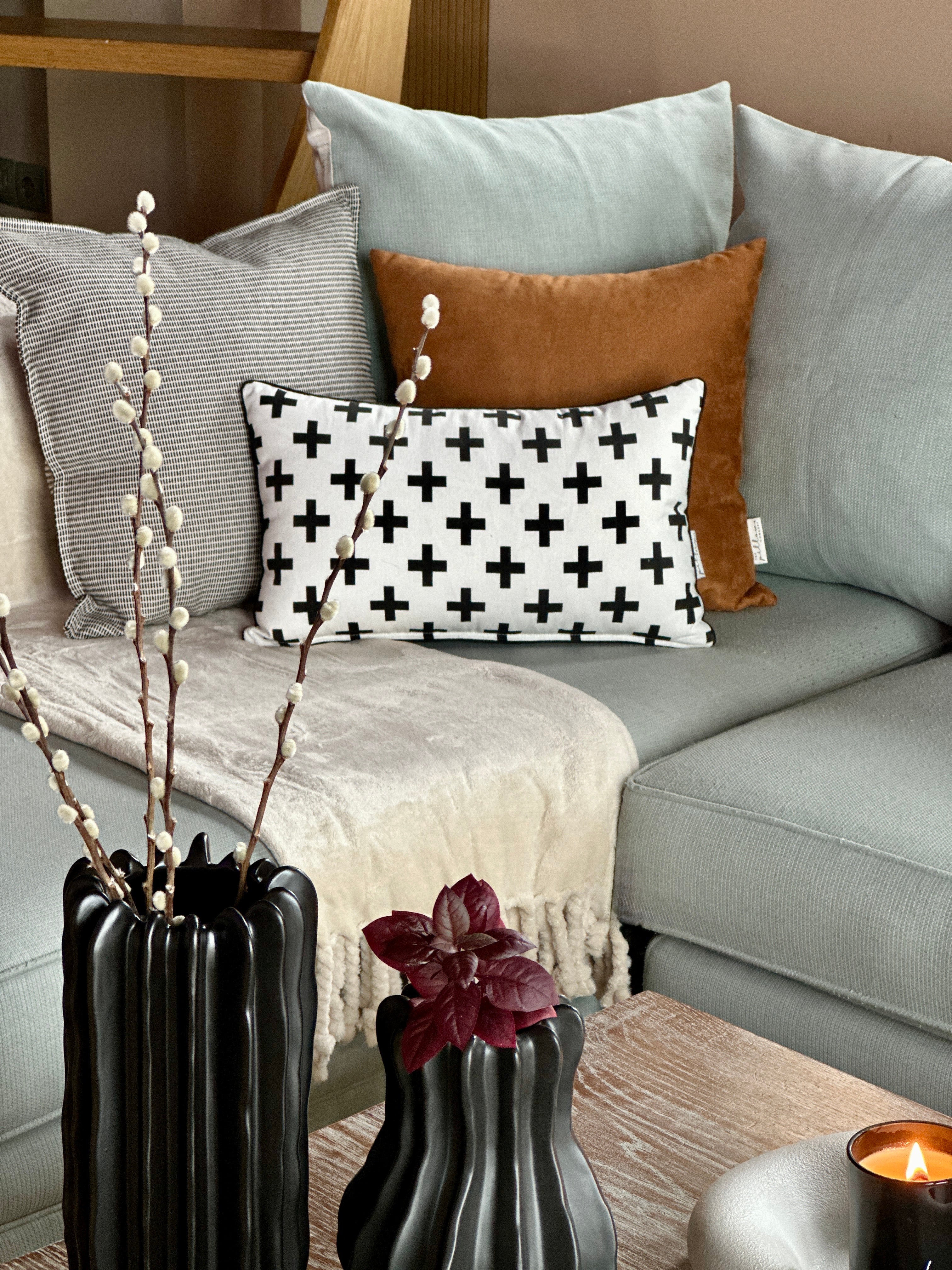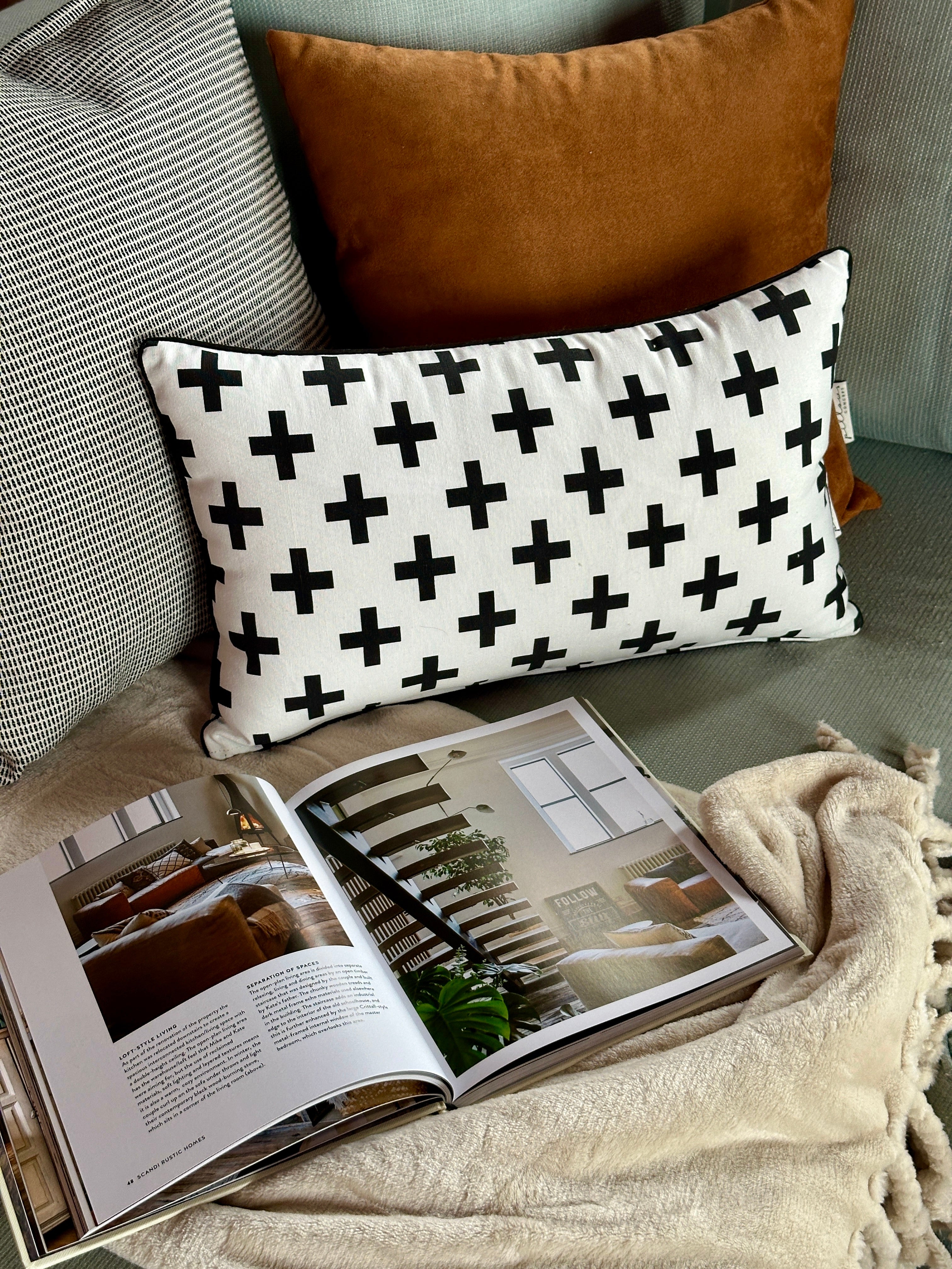 Με το μινιμαλιστικό scandi cross μοτίβο του και την αντίθεση άσπρου-μαύρου, αυτό το μαξιλάρι δίνει δυναμικό χαρακτήρα στον χώρο, αποτελώντας statement προσθήκη σε μοντέρνες ή bold συνθέσεις. Το μαύρο βαμβακερό κορδόνι περιμετρικά προσδίδει στο σχέδιο ένταση και καλοφινιρισμένο τελείωμα.