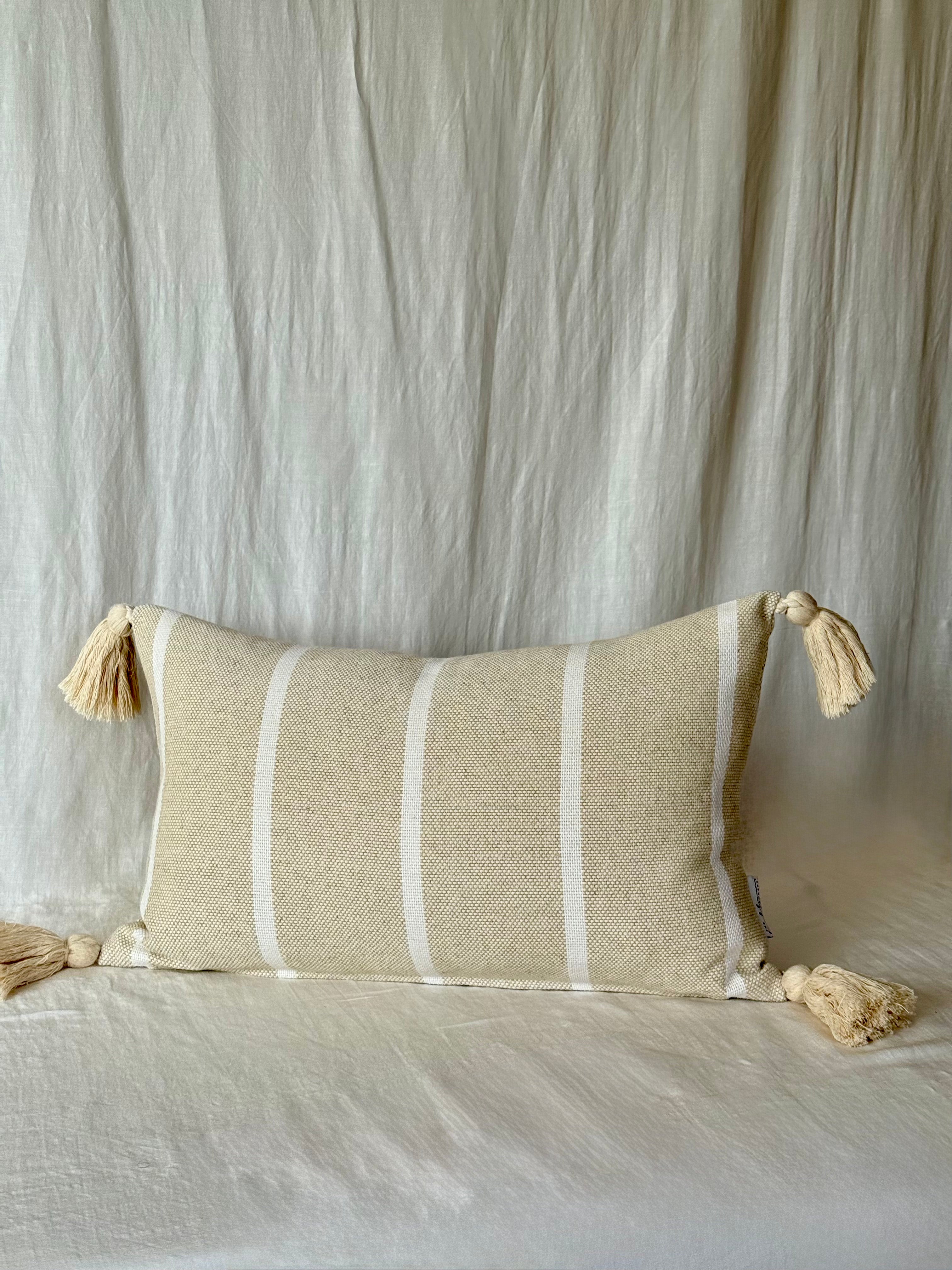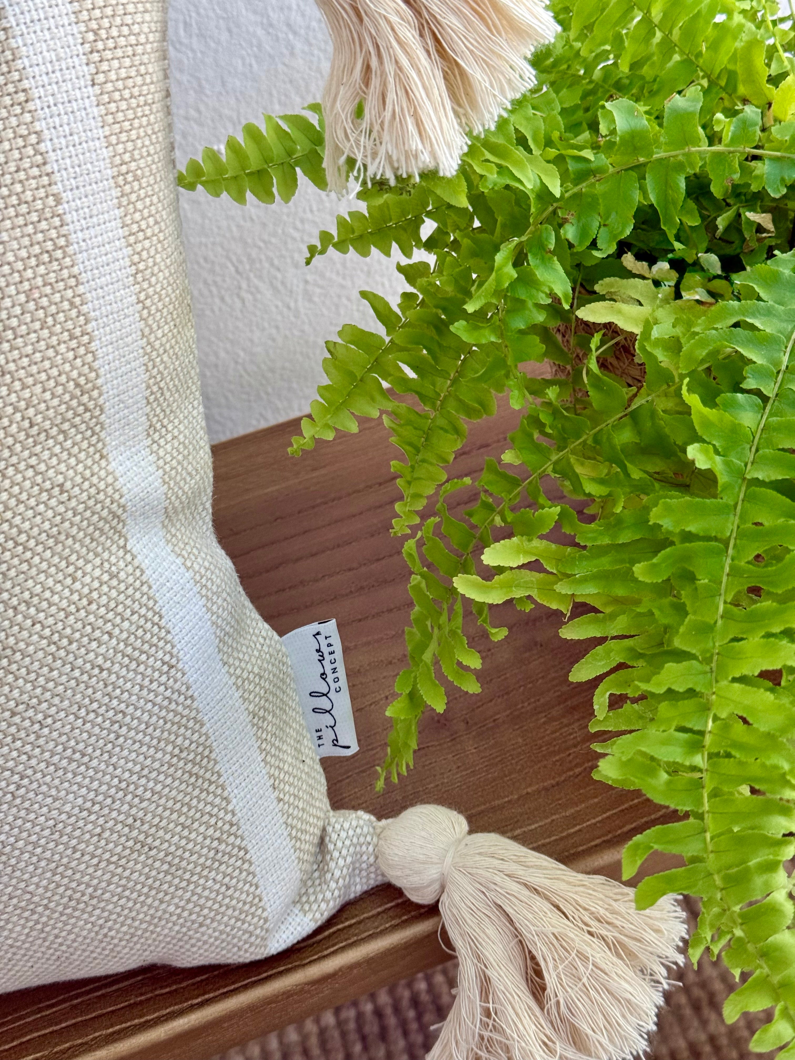 Aπό 100% βαμβακερό ύφασμα σε φυσικό beige, το μαξιλάρι αυτό ξεχωρίζει για το pattern του με ομοιόπαχες ρίγες και για τον διακριτικά boho χαρακτήρα του. Οι πλούσιες βαμβακερές χειροποίητες φούντες προσδίδουν κίνηση και τρισδιάστατο ενδιαφέρον, τονίζοντας την αισθητική του.